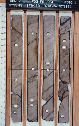 Yellow fine-medium, moderately sorted sandstone with calcareous cement. The sands are often characterised by one or two coal beds, showing a spiky character on the GR-log. The sandy bodies have a distinct coarsening upward trend. In a few areas a double sand body is present, both parts with a coarsening upward trend.