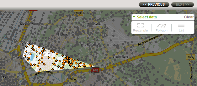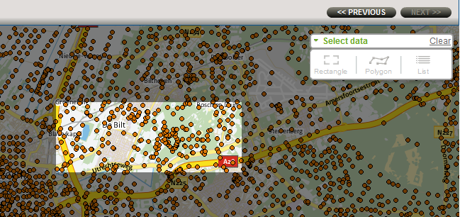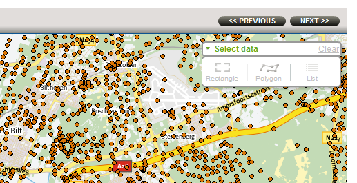 The objects shown on the map fit the settings that you specified in Step 1. Select the data you want to apply by clicking on the button “Select data” top right of the map screen. The menu can be expanded or collapsed by clicking the triangle. You can use a rectangle or polygon to select data. All data outside the selection will be grey on the map.