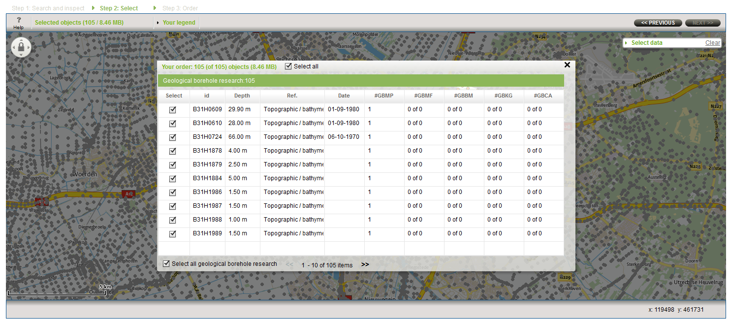 In this step you select the data you wish to order by drawing an area on the map using the options in the “Select data”. To view the selected data in tabular form, use the “Show selection” button. You can adjust the selection in this table.