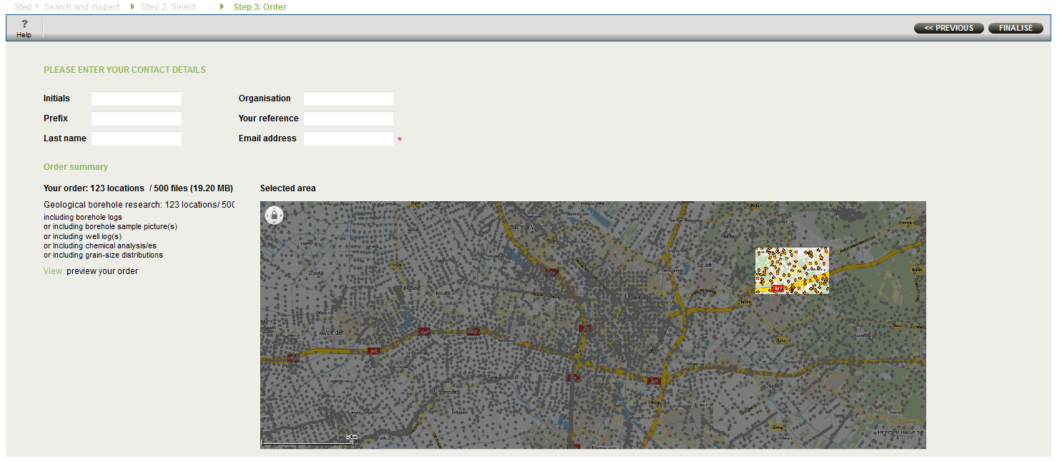 In this step, enter your contact details to place your order, and review and finalise your order. The fields marked with an asterisk (*) must be completed, the other fields are optional. Click bottom left to preview your order before submitting it.