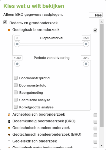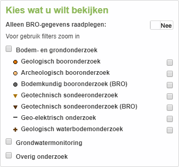 Standaard zijn alle kaartlagen beschikbaar. Met het activeren van de knop "Alleen BRO-gegevens" worden uitsluitend de kaartlagen met BRO-gegevens getoond. Je kunt de kaartlagen voor een domein activeren door de checkbox aan te vinken: