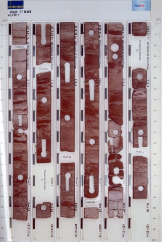Roodbruin klei- en siltsteen interval met een paar zand-/siltsteensnoeren.