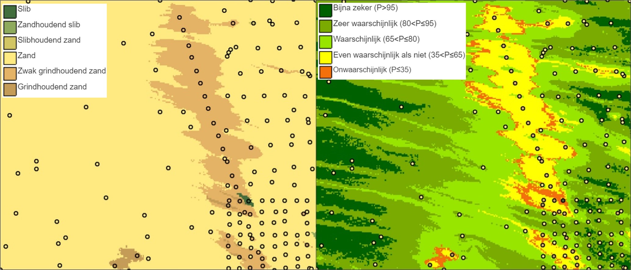 Op de drie sediment- en onzekerheidskaarten kunnen als optie vrijwel alle bij de kartering gebruikte puntgegevens worden geprojecteerd. Alleen ongeveer 100 vertrouwelijke punten ontbreken. Voor elk van de getoonde monsterlocaties is een boorbeschrijving en/of korrelgrootteanalyse beschikbaar, te raadplegen via DINOloket, het portaal bij de digitale opslagplaats van de Geologische Dienst Nederland. Aan de hand hiervan berekende Folk-klassen zijn in dezelfde kleurcodering weergegeven als de sedimentkaarten. De sedimentdata zijn een basisonderdeel van de systematische geologische kartering van de Noordzee tussen eind jaren ’70 en 2003, of het resultaat van incidentele onderzoeks- en commerciële projecten. Bij commercieel werk, veelal langs kabel- of pijpleidingtracés, kunnen bemonsterings- of beschrijfmethoden zijn gehanteerd die kwalitatief minder zijn dan de in de systematische kartering gebruikte uniforme standaard. Op de sedimentkaarten vertaalt dit kwaliteitsverschil zich in opvallend lineaire zones als de Folk-klasse afwijkt van die voor datapunten in de directe omgeving. Op de onzekerheidskaarten vallen deze zones op door een relatief lage waarschijnlijkheid van de voorspelling.