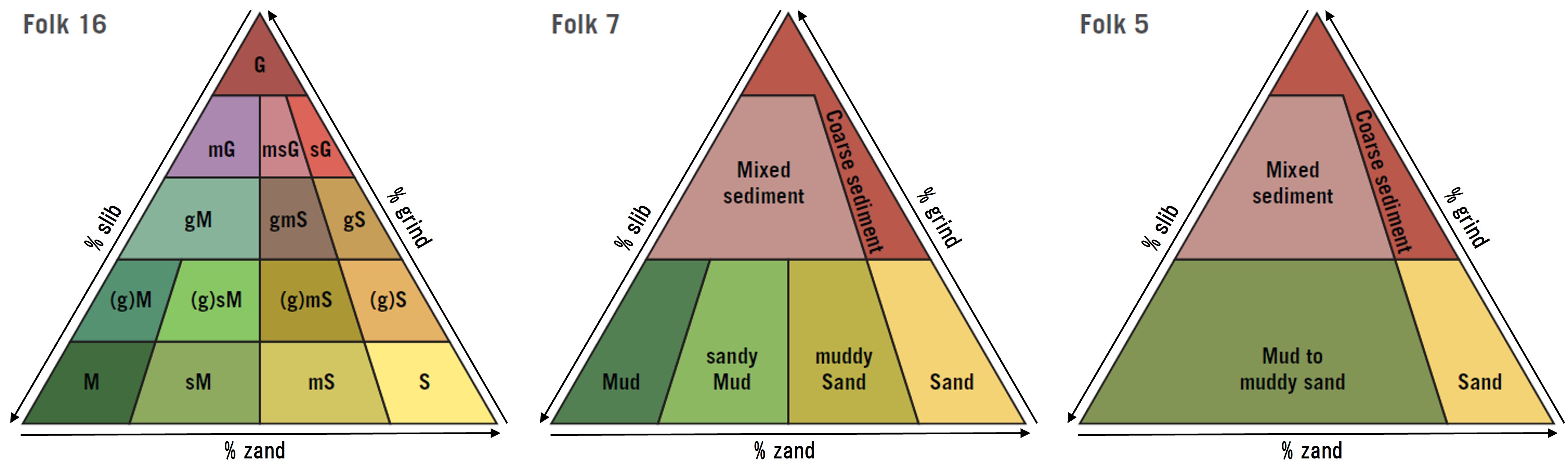 Folk 16 verwijst naar de volledige classificatie van sediment zoals ontwikkeld door de Amerikaan Robert Folk (1954), aangevuld met een categorie voor alle sedimentklassen grover dan grind – stenen, keien en blokken – en vast gesteente. Dit is de internationale standaard. Folk 7 voegt een aantal sedimenttypen samen en is vooral geschikt als een vereenvoudigde weergave van de hele Nederlandse Noordzeebodem nodig is. Folk 5 sluit aan bij het European Union Nature Information System (EUNIS), een geharmoniseerd informatiesysteem van Europese habitattypes. Per kaart is voor iedere rastercel ook de waarschijnlijkheid van de weergegeven klasse gevisualiseerd. Die is belangrijk als een kaartbeeld wordt gebruikt om beslissingen te nemen. De gehanteerde onzekerheidsklassen geven zowel numeriek als tekstueel weer hoe zeker we zijn van onze voorspelling.